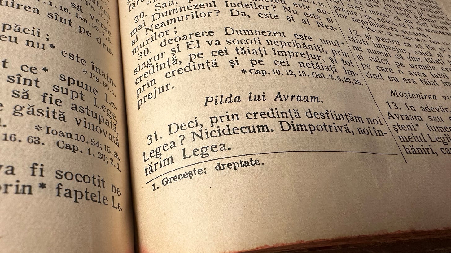 Cel mai probabil aceasta a fost tensiunea trăită și de Cornilescu. Cornilescu afirmase că prin cuvântul „dreptate” „cititorul roman nu poate înțelege textul și își face o idee greșită despre acest subiect cât se poate de important”. El însuși trecuse prin experiența aceasta, când, la finalul traducerii NT se descoperise a fi un păcătos sortit iazului de foc.